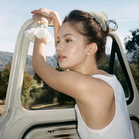 Simple and chic, our eyelet scrunchies feature a linen decorated design for added charm. A must-have statement accessory, they can be styled as bracelets or used to adorn any bun, completing your daytime look.