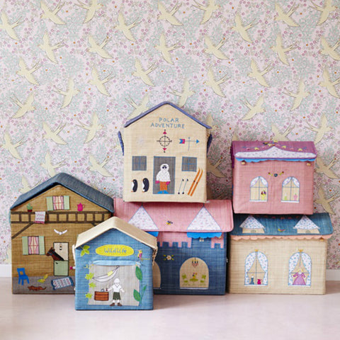 Fun new pretty pink small Princess Castle raffia toy basket embroidered with pictures of the castle windows and a aqua blue floral linning. This version of the toy baskets folds flat so that it can be stored easily but then assembles into a beautiful box for storing toys and playing with. The baskets would look lovely on a bedroom shelf and will provide hours of fun and hopefully encourage the tidying up of things! The lid of each storage basket opens to give easy access, and each basket has a carry handle on each side. There is also two buttons to secure the lid closed.