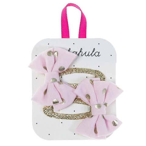 Two beautiful double layered bows with foil spots, each placed on a lurex ribbon wrapped clip.