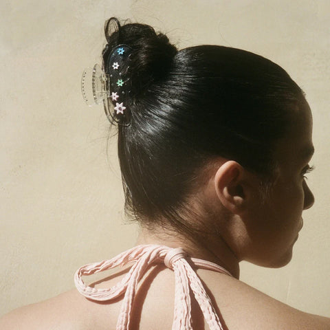 Sweet as can be, this clip is made with beautiful tiny stones and biodegradable acetate. Designed with love and ultra-femininity in mind, our sweetheart hair clip will hold your hair from morning until night. Perfect for a low bun or half-up-half-down look.